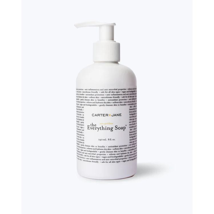The Everything Soap™ is formulated with certified-organic and naturally derived vegan ingredients. Carter+Jane biodegradable, cruelty-free ingredients pose no threat to the environment or to animals and are completely safe and non-toxic for use on humans of all ages. Carter+Jane never use synthetic preservatives, thickeners, or foaming agents, which are harmful to your skin health and, in Carter+Jane opinion, completely unnecessary. And unlike most soap on the market, The Everything Soap™ doesn't strip away your skin's microbiome...the good bacteria on your skin to protect you from pathogens that could negatively affect your skin and overall health.