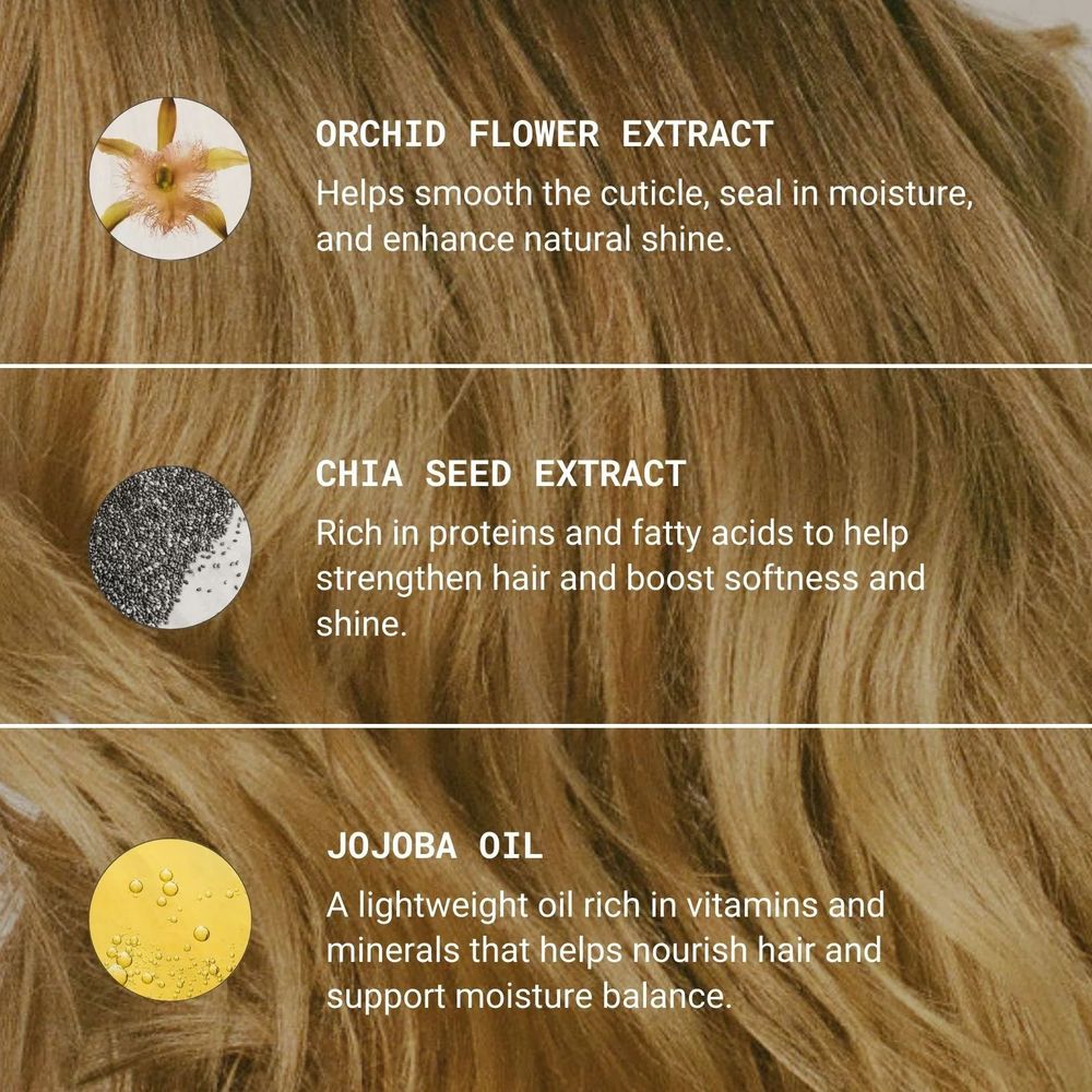 Water, Aloe Barbadensis Leaf Juice, Cetyl Alcohol, Glycerin, Behetrimonium Chloride, Cetearyl Alcohol, Polyquaternium-37, Behenyl Alcohol, Sodium PCA, Simmondsia Chinesis (Jojoba) Seed Oil, Phenoxyethanol, Benzoic Acid, Ethylhexyglycerin, Glycereth-2 Cocoate, Jojoba Esters, Panthenol, Disodium EDTA, Tocopherol, Butylene Glycol, Orchis Mascula (Orchid) Flower Extract, Linum Usitatissimum (Linseed) Seed Extract, Salvia Hispanica (Chia) Seed Extract, Benzyl Alcohol, Citrus Aurantium Bergamia (Bergamot) Oil, Citrus Paradisi Grapefruit) Oil, Fragrance, Xylitol, Caprylic Acid