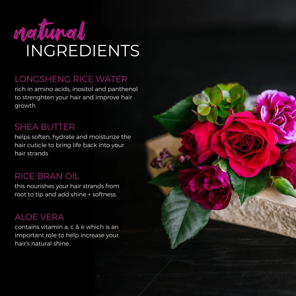 Shea Butter: conditions, moisturizes. Rice Bran Oil & Hydrolyzed Rice Protein: increases volume and shine, strengthens.